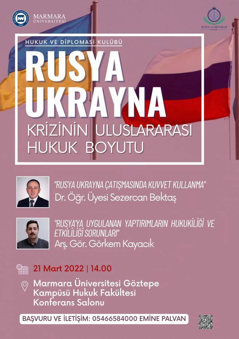 Marmara Üniversitesi Hukuk Fakültesi Hukuk ve Diplomasi Kulübünün düzenlediği, Fakültemiz Kamu Hukuku Bölümü Milletlerarası Hukuk Anabilim Dalı Öğretim Üyesi Dr. Öğr. Üyesi Sezercan BEKTAŞ ve Arş. Gör. Görkem KAYACIK' ın konuşmacı olarak katılacağı konferansa ilişkin bilgilendirme.
