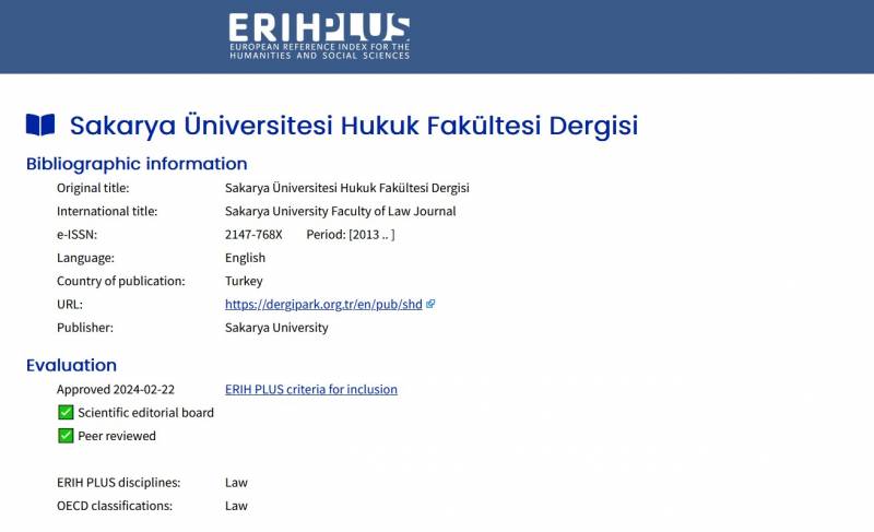 Bilimsel yayın hayatına 2013 yılında başlayan ve hâlihazırda ulusal ULAKBİM TR- Dizin Endeksi tarafından taranan Sakarya Üniversitesi Hukuk Fakültesi Dergisi (“SHD”), 22.02.2024 tarihi itibarıyla prestijli uluslararası alan endeksi ERIH PLUS’ta (European Reference Index for the Humanities and Social Sciences) taranmaya başlamıştır.