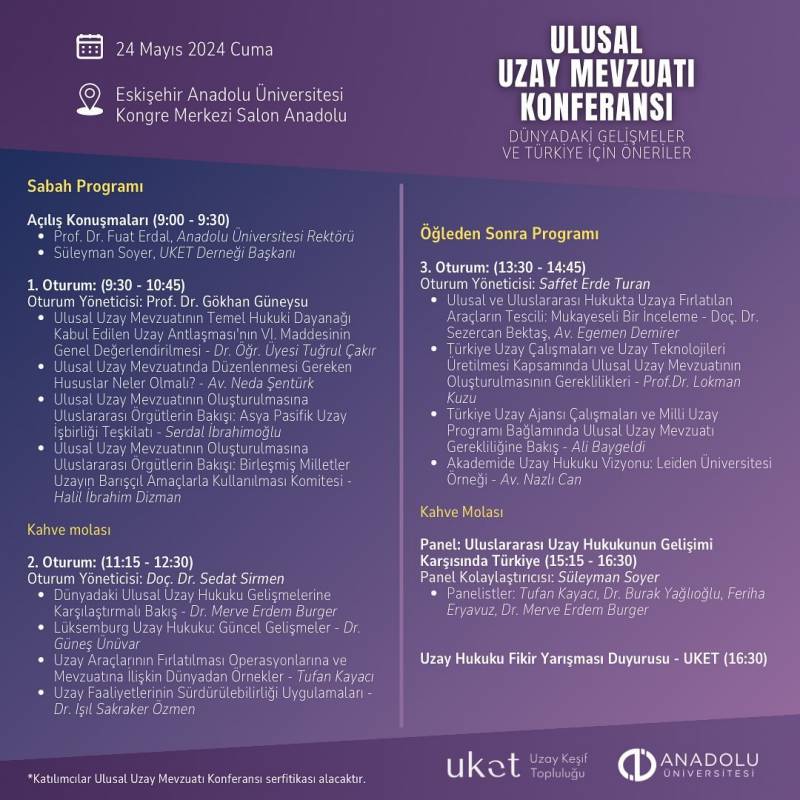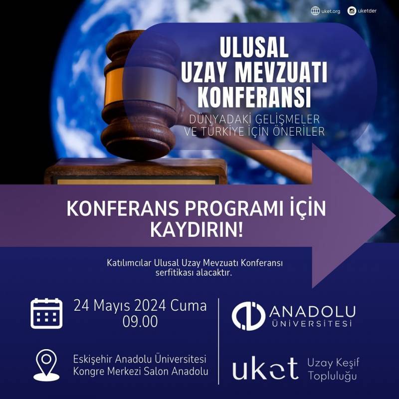 Uzay Keşif Topluluğu Derneği ve Anadolu Üniversitesi ile ortak düzenlenen "Ulusal Uzay Mevzuatı: Dünyadaki Gelişmeler ve Türkiye İçin Öneriler" Konferansı 24 Mayıs 2024 tarihinde gerçekleşecek olup katılımcılar Ulusal Uzay Mevzuatı Konferansı sertifikası alacaktır.