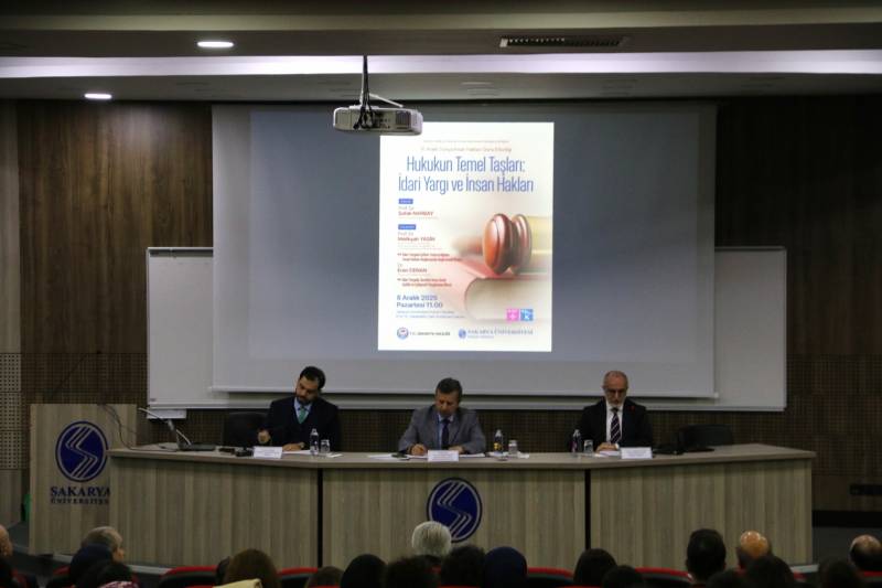 Sakarya Valiliği ve Sakarya Üniversitesi Hukuk Fakültesi iş birliğinde düzenlenen “Hukukun Temel Taşları: İdari Yargı ve İnsan Hakları” etkinliği, 8 Aralık 2025’te Fakültemiz Prof. Dr. Sabahattin Zaim Konferans Salonu’nda gerçekleştirildi.