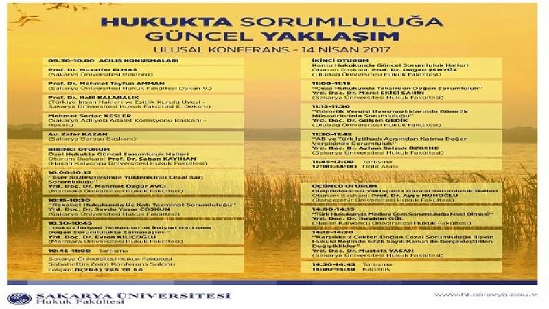 Hukukta Sorumluluğa Güncel Yaklaşım konulu ulasal konferans 14.04.2017 tarihinde , Fakültemiz Dekan V. Prof.Dr.Tayfun AMMAN, geçmiş dönem Dekan Vekili ve Türkiye İnsan Hakları ve Eşitlik Kurulu Üyesi Prof. Dr. Halil Kalabalık, Sakarya Adliyesi Adalet Komisyonu Başkanı Hakim Mehmet Sertaç Kesler, Sakarya Barosu Başkanı Avukat Zafer Kazan, akademisyenler ve öğrencilermizin katılımı ile gerçekleşti.